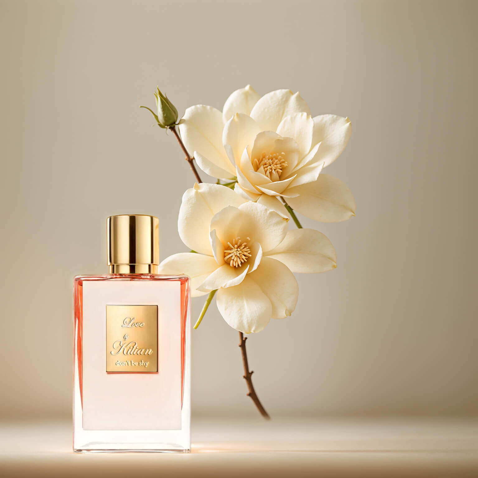 Kilian "Love" luxury perfume bottle with elegant magnolia or gardenia blooms against a neutral beige background. The rectangular bottle with gold accents and coral-pink liquid is paired with cream-colored flowers for a refined, luxurious presentation.